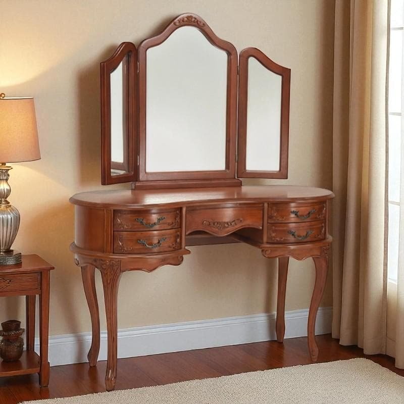 - オーダーメイドで、なら材、LA色に変更して作ってもらいました。プレゼントでいただいた木工品もかわいいです。 とても収納力があり、今まで使用していたドレッサーとプラスチックケースの中身全てを収納しても引き出し二段、椅子の収納が空いています。同じシリーズのチェストも欲しいと思っています。