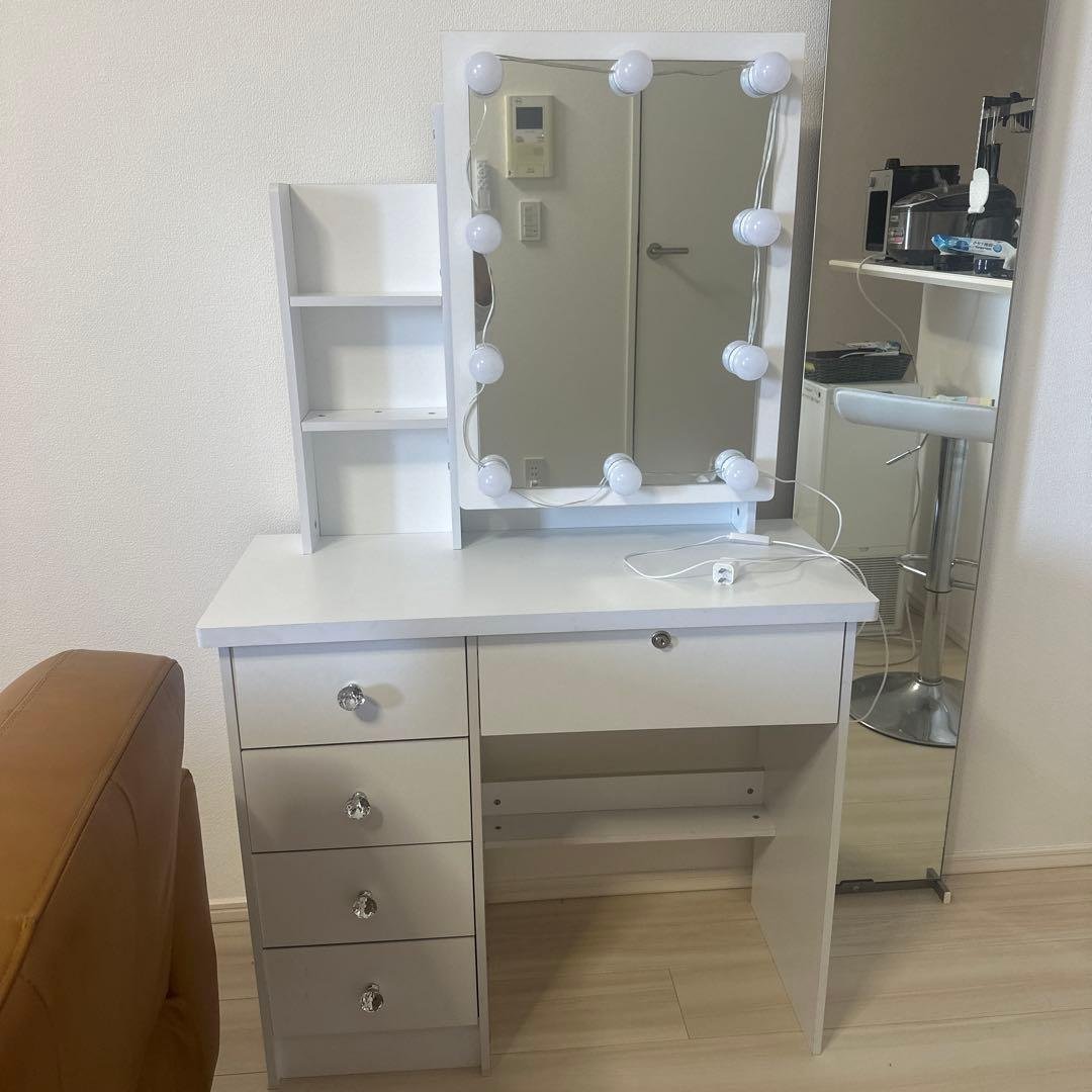 - 探してたんです。机の上に置いて使えて、しかもある程度の収納力のある大きさのドレッサー。 もう一回り小さいものはイロイロあるのですが、私はこのくらいの大きさは欲しいと思っていたので、すごく探しました。 しかも、真っ白で、つやつやの美しいドレッサーでイメージにぴったりでした。 買い置きしてあったクリームなども入れておけますし、満足です。 ただ、細かいものを入れる棚が可動式で一つあるのですが、すぐ取り外せるので、もう一つあってもいいのかな。と思いました。私は、自分で牛乳パックで作ったものをはめ込んで使っています。鏡の角度が変えられるのもいいですね。いつも同じ机の上で使うわけではないので、移動した時にあわせて使えるのがいいです。 大満足!!!